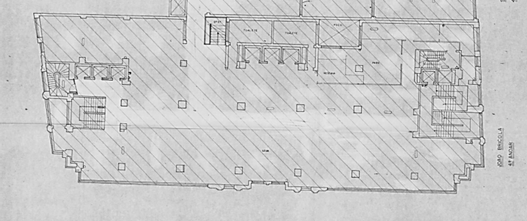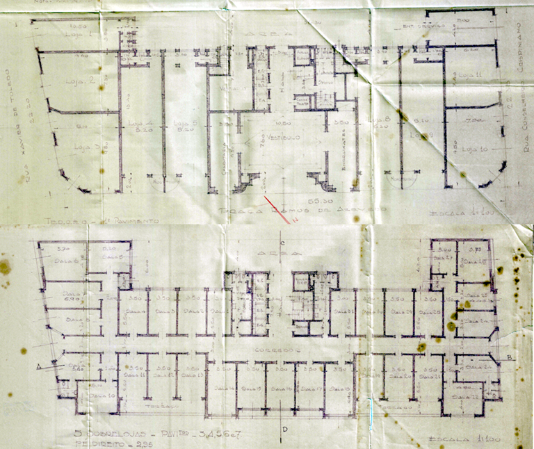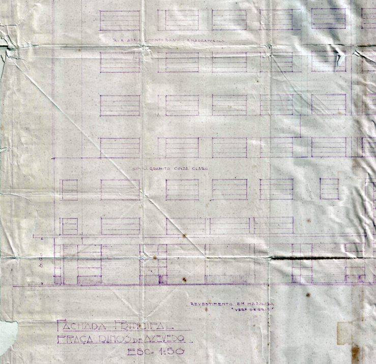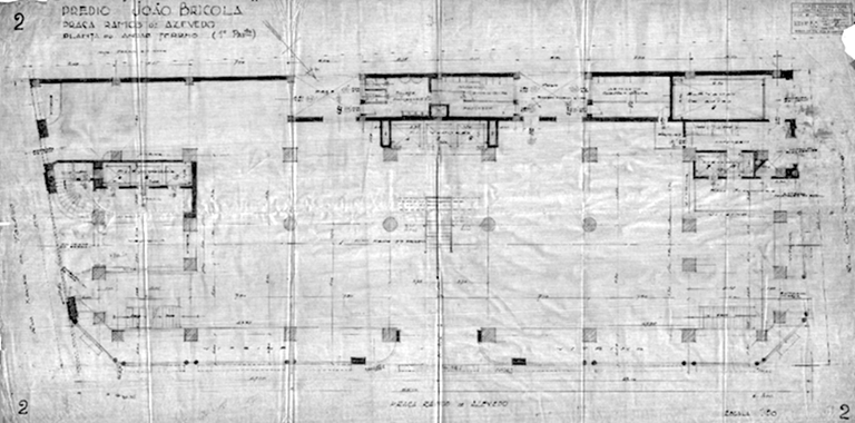 Baseando-se nessas premissas, recorreu-se ao Arquivo Público Municipal em busca de documentos que pudessem revelar os aspectos ocultos. Assim, 25 processos relacionados ao endereço foram encontrados, a maioria sem relevância; alguns tratavam de isenção de IPTU, outros tratavam de renovações de licença de funcionamento, vistorias etc. Quatro processos chamaram a atenção: um deles de 1951 tratava de uma reforma no térreo, assinada por Gregori Warchavchik; outro, de 1987[9], trazia levantamentos completos da arquitetura da fase em que a loja ocupou outros dois edifícios adjacentes, o Stella e o Boa Vista, ambos na Rua Conselheiro Crispiniano e que se interligavam internamente com o João Brícola, ampliando sensivelmente a loja. Por fim, dois processos de 1936 relacionavam-se ao alvará de obras; optou-se, então, para este trabalho, pela análise desses documentos.