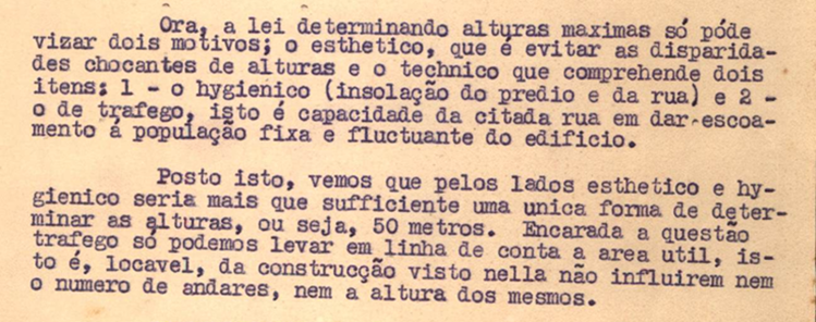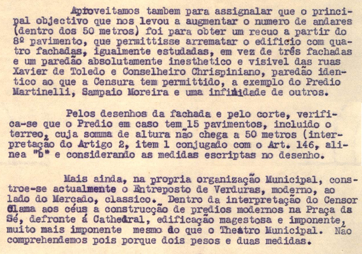 O processo segue com uma resposta de quatro páginas da construtora, assinada por Heitor Portugal e protocolada em 21 de julho de 1936. A seguir, reproduzimos os trechos mais relevantes que se referem aos aspectos da limitação de pavimentos e da fachada, argumentos que podem ser interpretados como os que sustentaram a morfologia do edifício que viria a ser de fato construído.