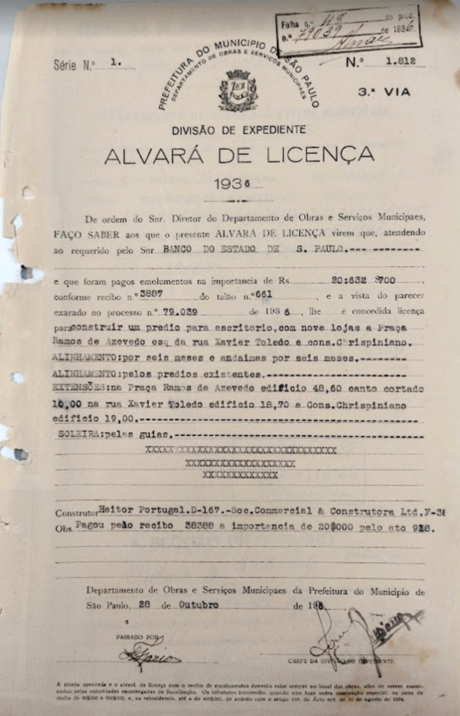 [16] São Paulo (Município). Processo administrativo nº 1981-0.011.281-9 (antigo/capa 0.079.039/36). Assunto: Edificação – alvará de construção [solicitante Banco do Estado de São Paulo AS]. São Paulo: Sistema de Arquivos do Município de São Paulo, Arquivo Intermediário de Processos, 1936b.