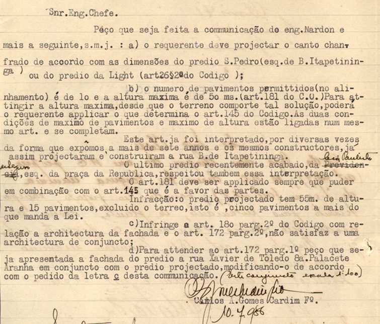 Em 10 de julho de 1936 um despacho de “comunique-se” alegava que o plano não estava em conformidade com o Código de Obras[14], pois excedia o limite de 10 pavimentos, além de considerar que a fachada não satisfazia a uma “arquitetura de conjunto”.