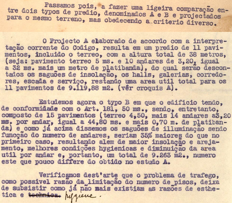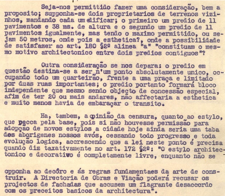 “[…] A parte apresenta agora novos estudos que foram approvados estando em condições de figurar no conjuncto architectonico da Praça e ruas adjacentes sem diminuir o valor do seu conjunto e sim engrandecer como uma boa expressão que é de architectura moderna. […]”